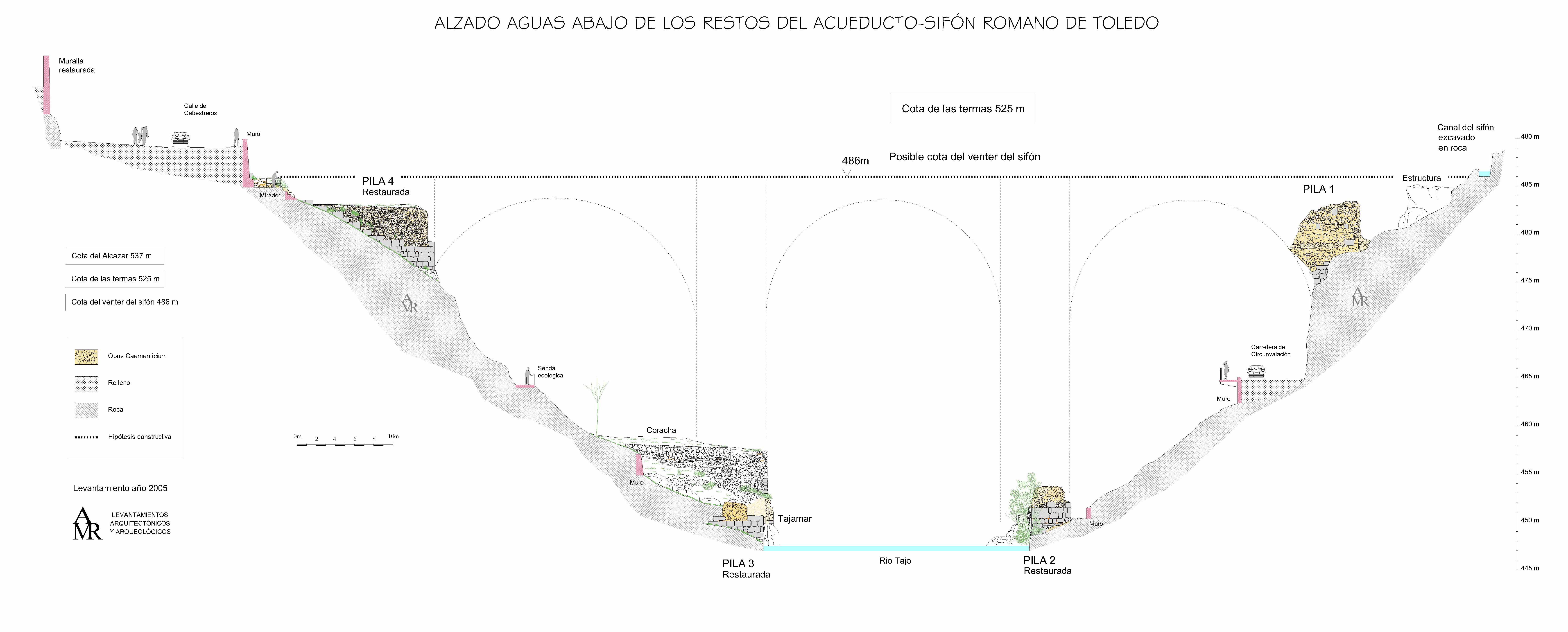 Levantamiento de los restos romanos del monumental acueducto sifón que atraviesa el rio Tajo. Diciembre 2005.