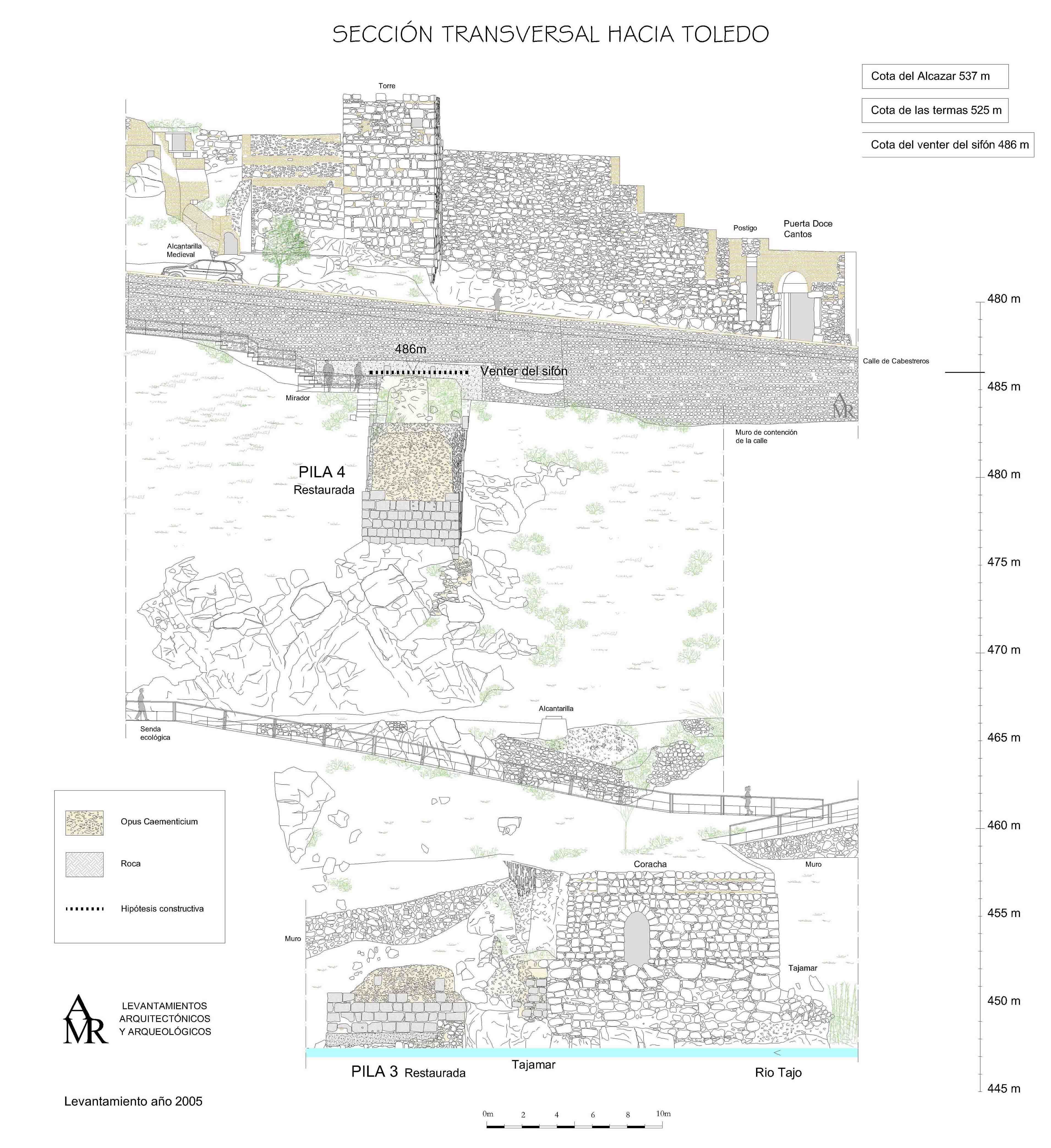 Levantamiento de los restos romanos del monumental acueducto sifón que atraviesa el rio Tajo. Diciembre 2005.