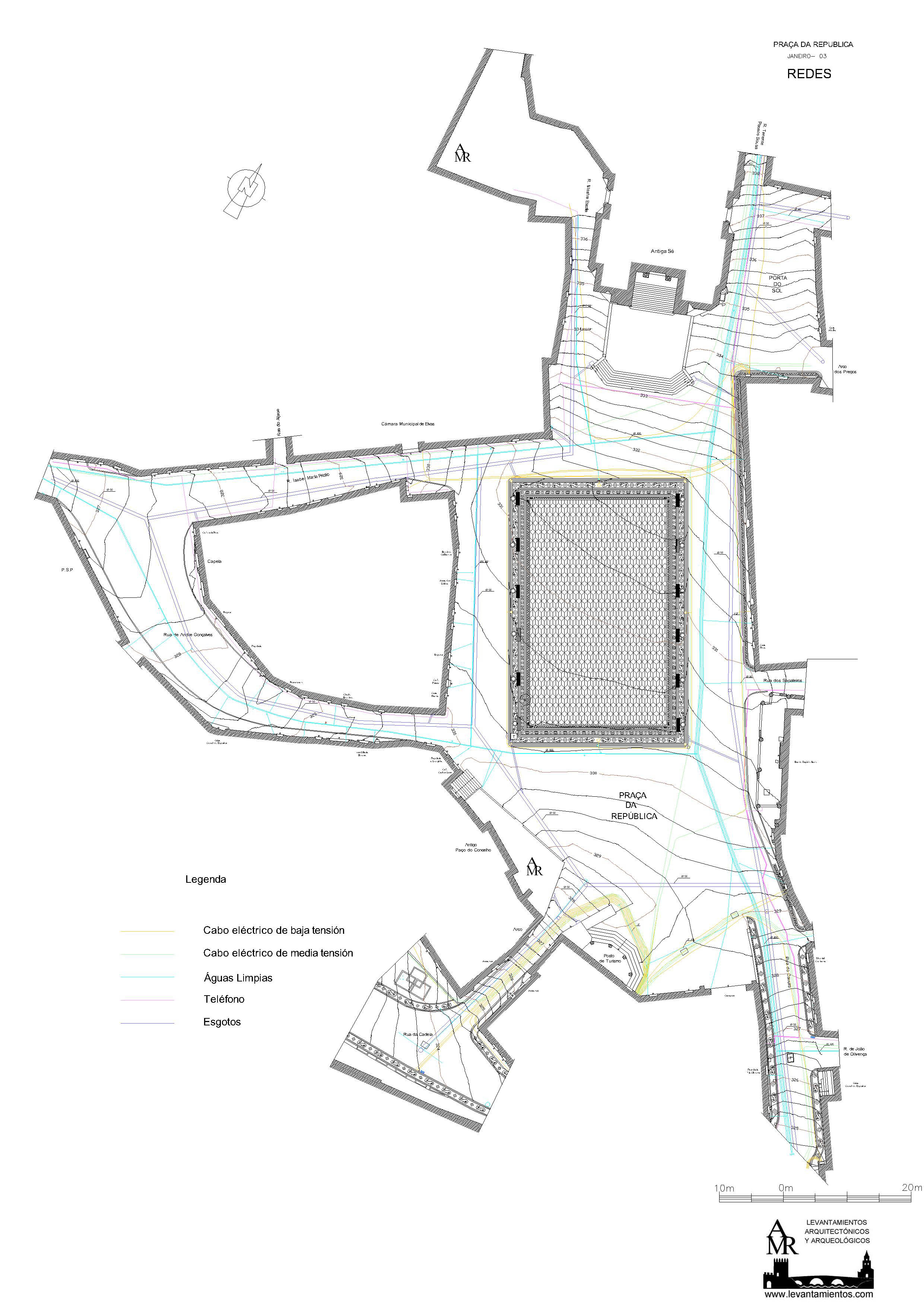 Levantamiento topográfico con curvas de nivel y localización de redes de saneamiento, luz, agua y teléfono.